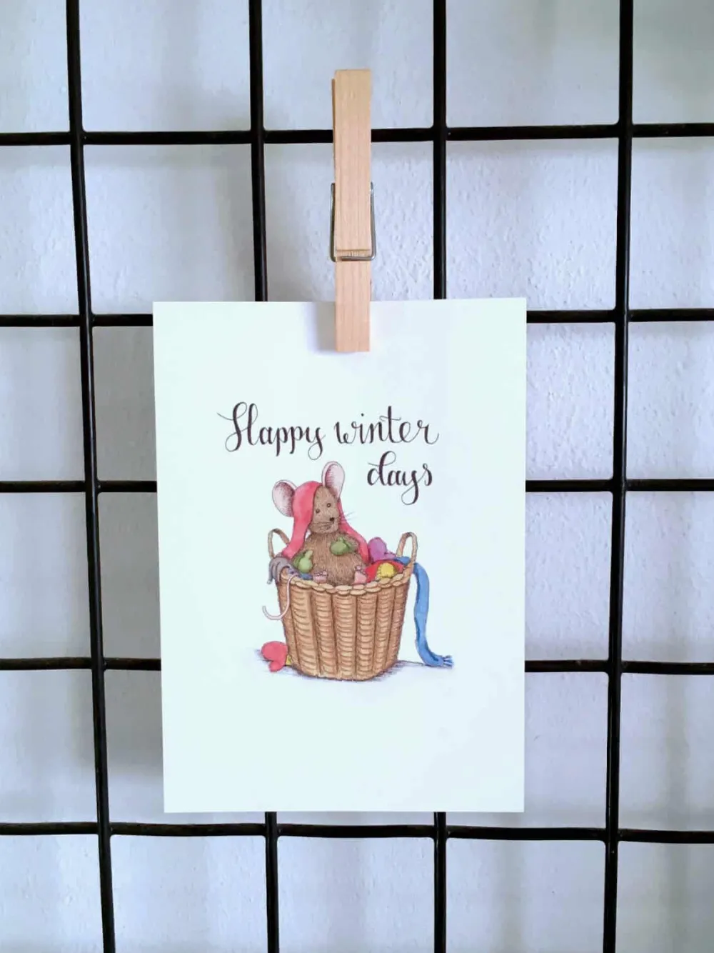 Anillustration Ansichtkaart Muisje in mand winterkleding