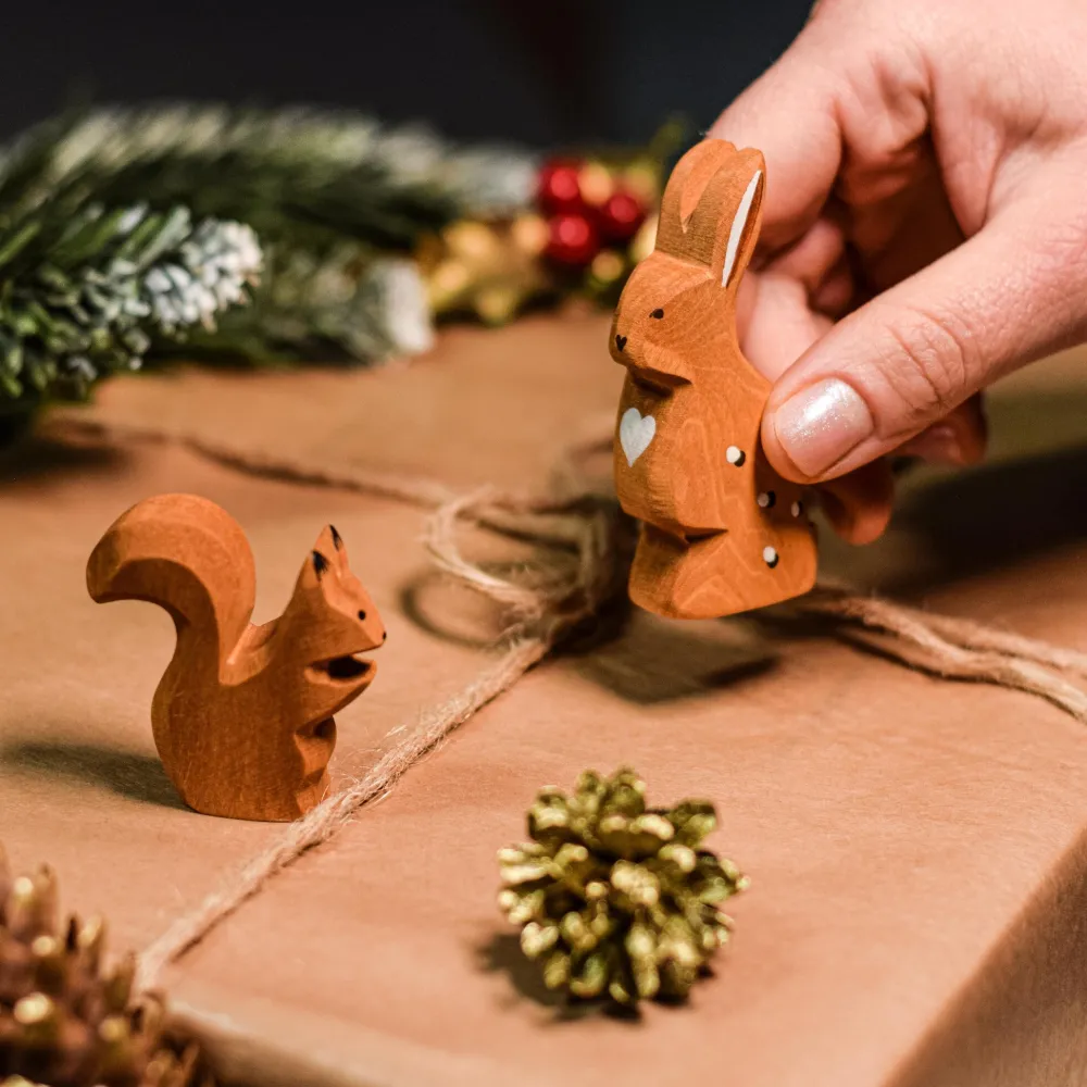 Dit is de eekhoorn in rennende houding van het Roemeense merk bumbu toys, gemaakt van esdoornhout en afgewerkt met niet giftige verf. De eekhoorn is 4.5 cm hoog. De afgebeelde bomen en andere dieren zijn optioneel verkrijgbaar in onze webshop.