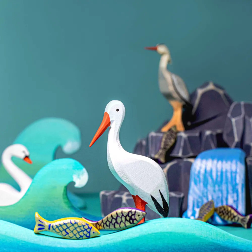 Dit is de ooievaar van het Roemeense merk bumbu toys, gemaakt van esdoornhout en afgewerkt met niet giftige verf. De ooievaar is 12 cm hoog. De overige dieren en accessoires zijn optioneel verkrijgbaar in onze webshop.