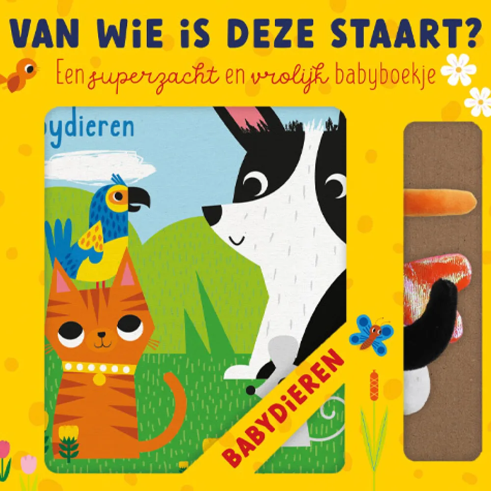 In dit kleurrijke boxje zit een zacht knuffelboekje, speciaal voor kleine babyhandjes. Raad jij van wie de staartjes zijn?