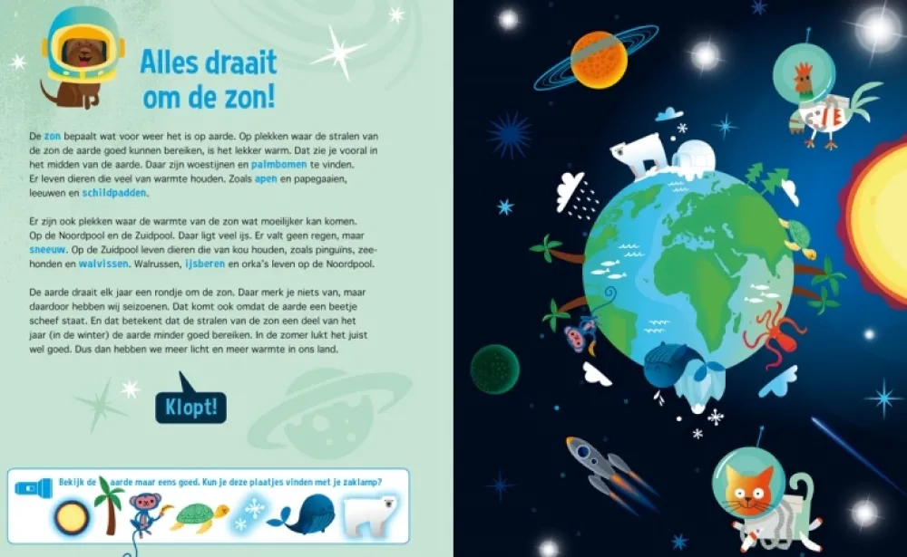 Het boek begint eerst met een educatief stuk over het onderwerp. Hier kom je ook gelijk de kartonnen zaklamp tegen. Vervolgens begint er een verhaal met dikgedrukte woorden. Deze dikgedrukte woorden staan onderaan de pagina afgebeeld.