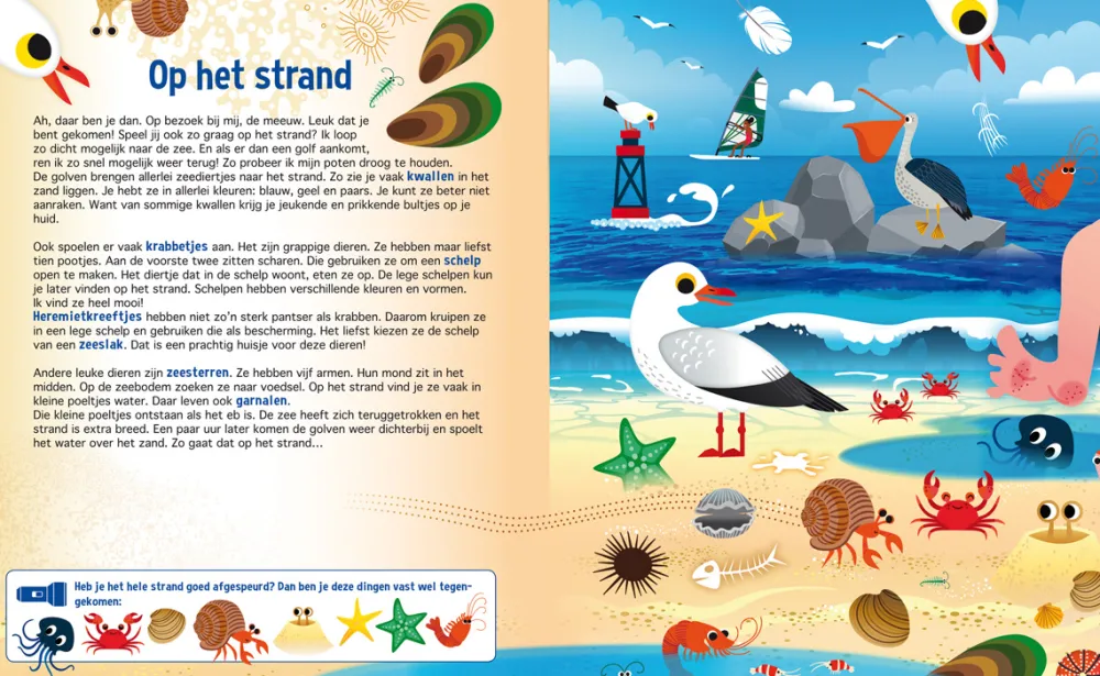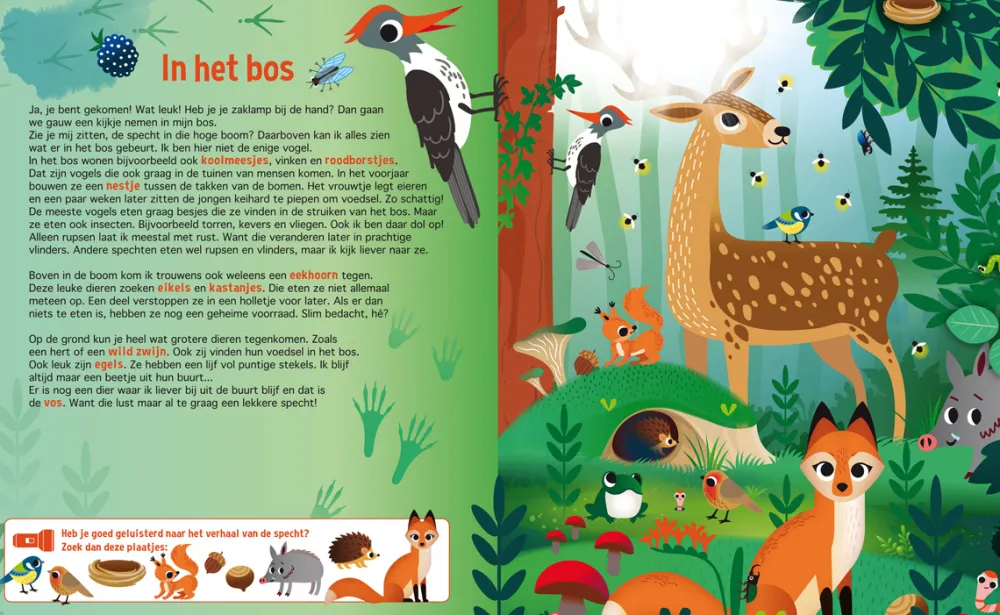 De rechterpagina is nu nog donker, maar als je de zaklamp hier achter plaatst ontstaat er een lichtbundel, net echt! Met de zaklamp kan er samen gezocht worden naar de afgebeelde dikgedrukte woorden. Zo lees je samen interactief een boek. Er zijn meerdere thema’s te verkrijgen in deze serie!