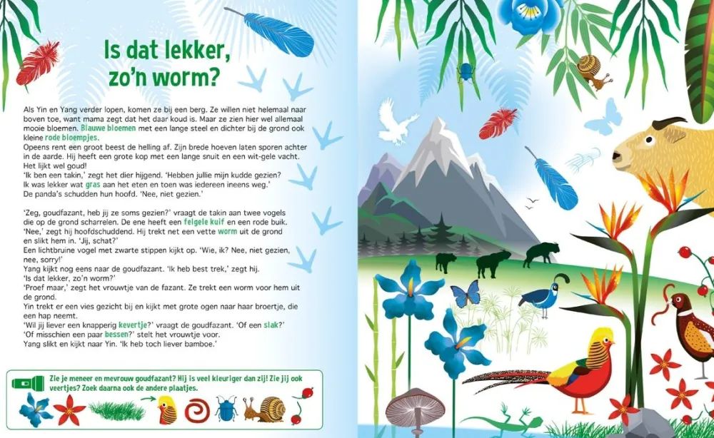 Yin en Yang zijn twee jonge reuzenpanda's die voor het eerst zelf het bos in mogen. Kom je ook kijken in het pandabos? Vrolijke voorleesverhalen met prachtige zoekplaten. Met een "zaklamp" van stevig karton. Leuke weetjes over de panda.