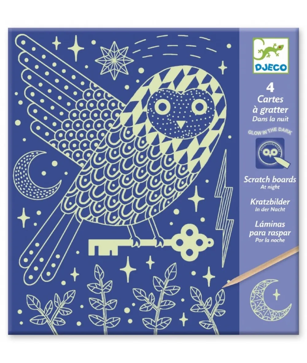 Een pak van 4 glow-in-the-dark kraskaarten om nachtdieren te ontdekken. De kinderen gaan met het houten pennetje over de motieven van de artiest heen en krassen de bovenste laag van de kraskaart weg. Verrassing: in het donker gloeien de dieren!