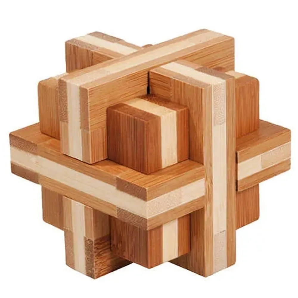 IQ-test, 3D-puzzel van bamboe, doos "dubbel kruis": 9x9x8 cm, moeilijkheidsgraad: 5 van de 5