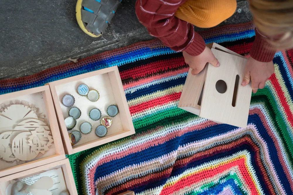 The box is thought to form knowledge around the principle of permanence, but it’s a great addition to symbolic play all the way to fitting, classifying, colour-matching and… endless more possibilities for you to discover!