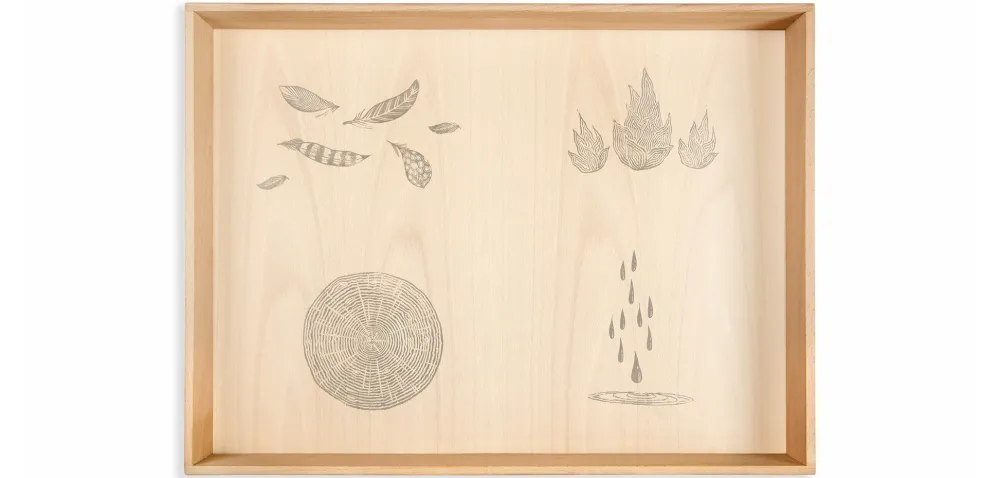Deze houten kist van Grapat is 45×65 groot en 7 cm hoog. In de box zitten vier handgemaakte en gestempelde natuurelementen.