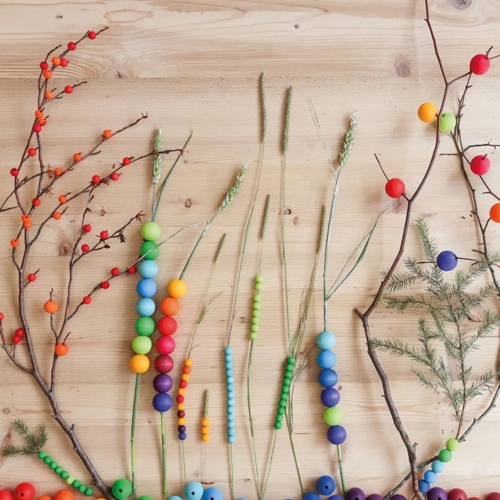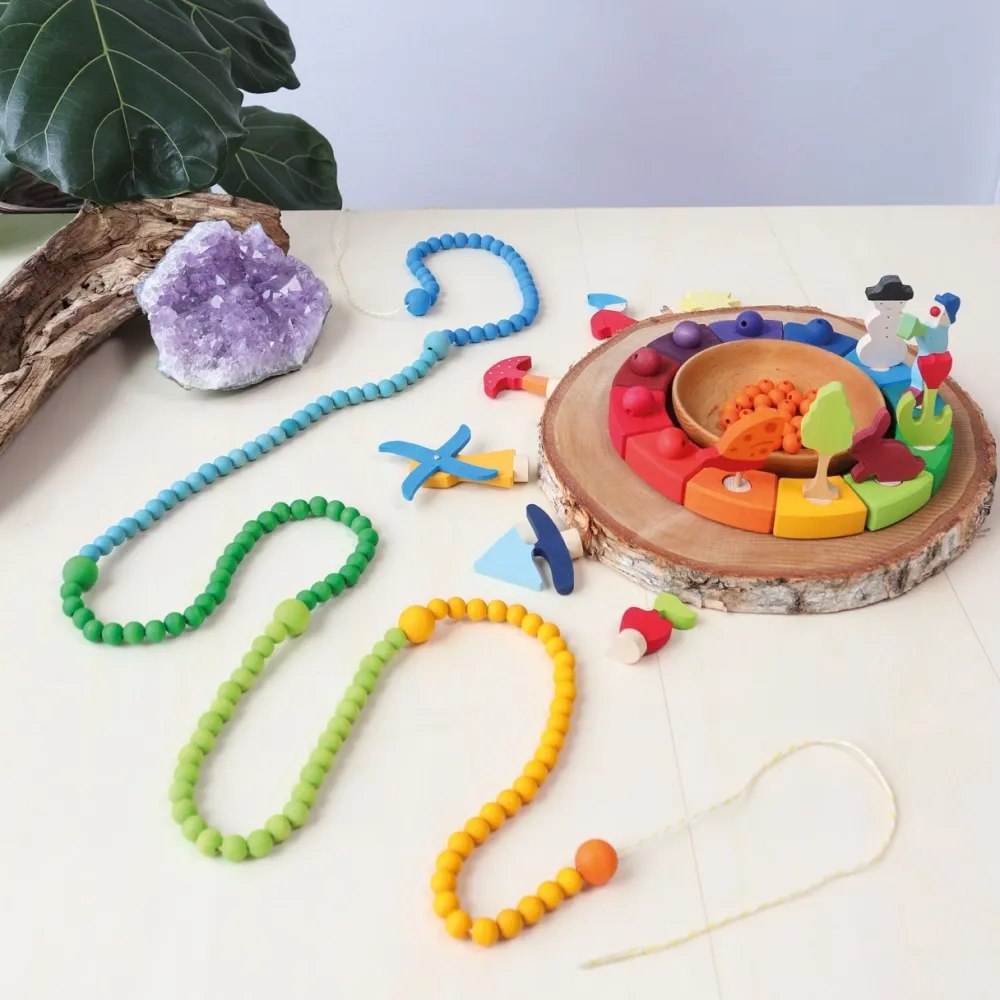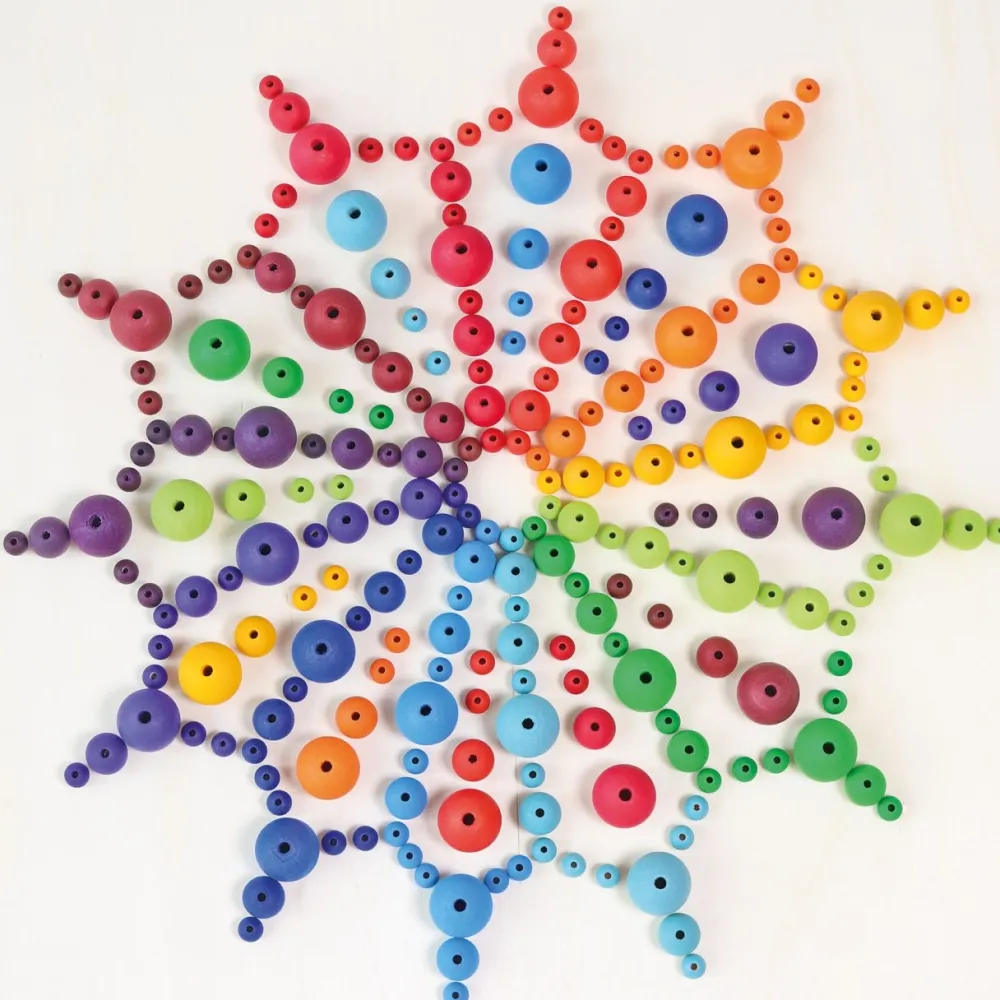 Deze set van Grimm's bestaat uit 480 houten kralen gemaakt van esdoornhout. De kralen zijn geschikt voor kinderen vanaf 4 jaar en hebben een doorsnede van 12mm.