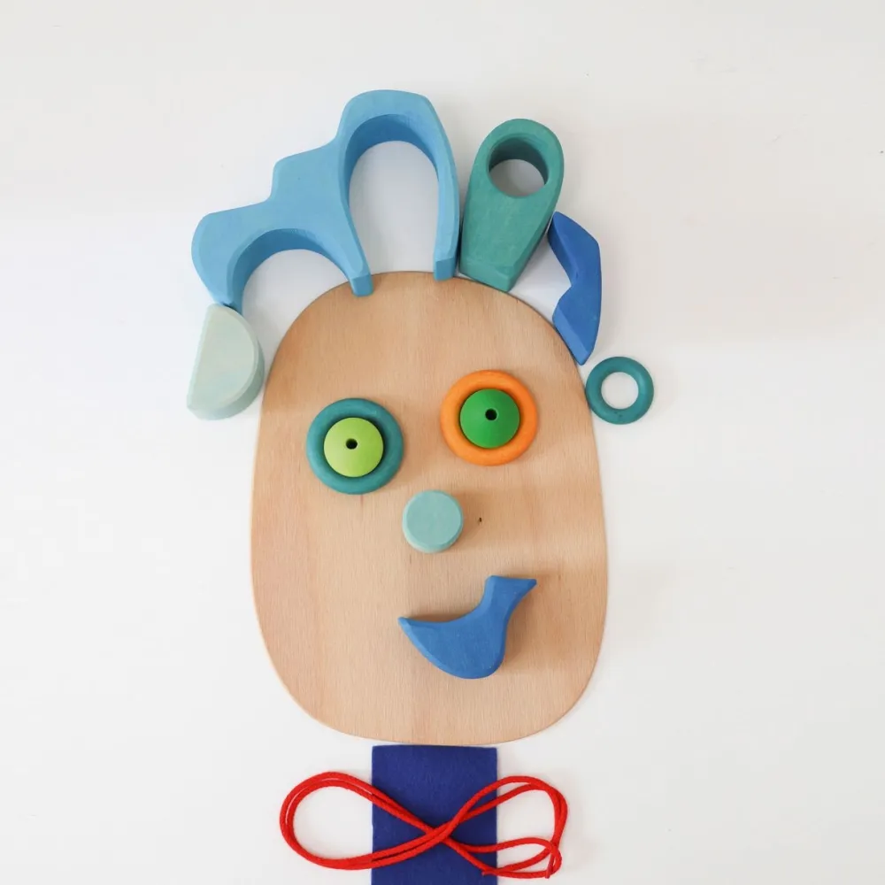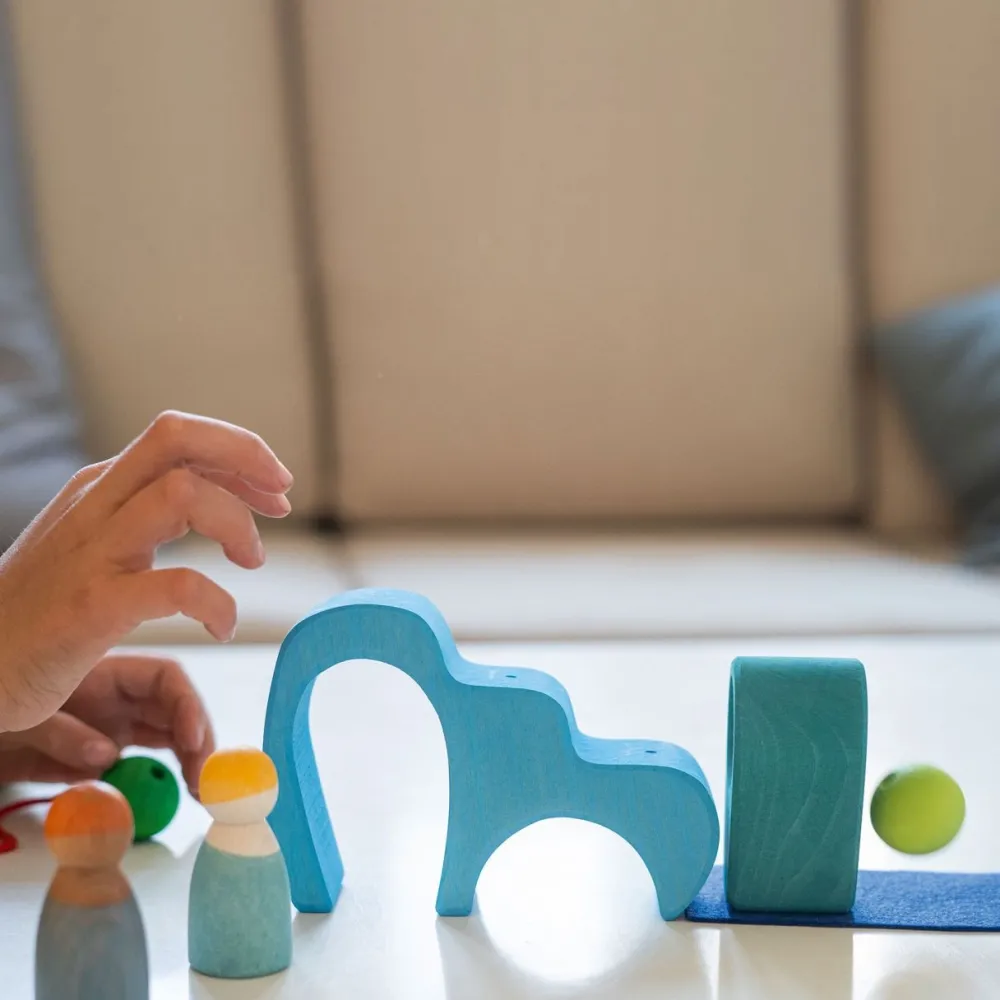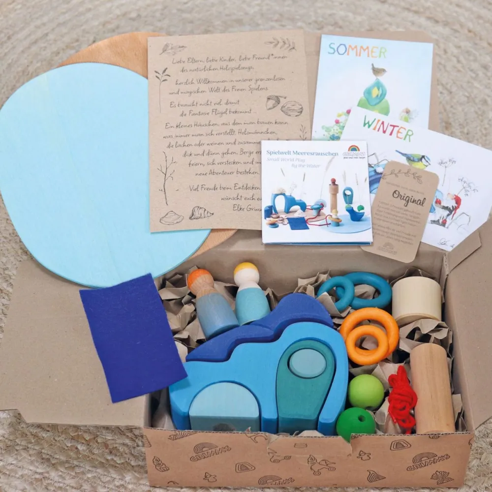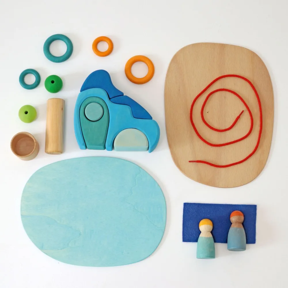 Deze houten set van Grimm's komt uit de speelwereld serie. De set bestaat uit 2 houten vrienden, 1 rol, 4 ringen, 2 parels, 1 schaaltje, 2 platen, 1 snoer en een stukje vilt.