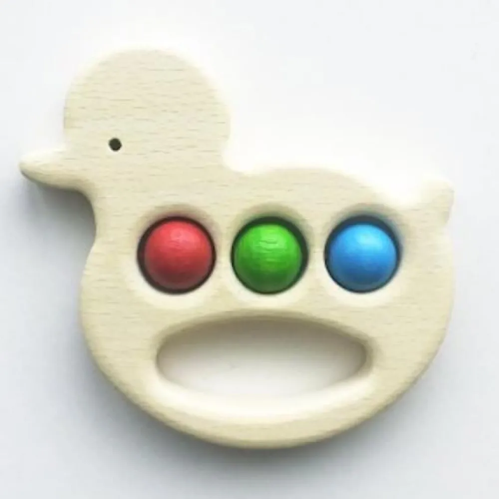 Deze grijpfiguur van Hess is hoogwaardig afgewerkt. Deze rammelaar in de vorm van een eendje heeft kleurige balletjes in zich, daar kunnen ze lekker mee rammelen.