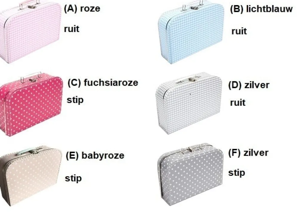 – geef in de omschrijving aan (kan tijdens het afronden van de bestelling) wat voor koffertje je wilt en welke naam/datum je op de koffer wilt hebben.