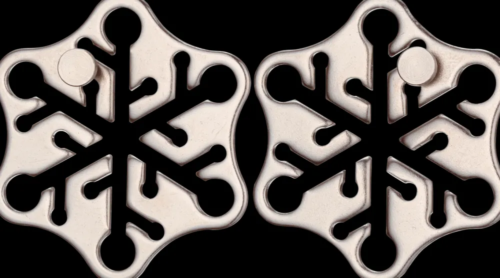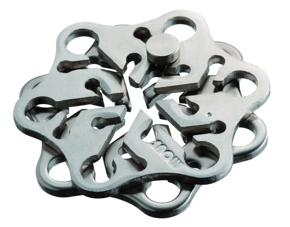A maze-type Huzzle created around the theme of a beautiful snow crystal. Following the designed route and separating the pieces creates movements like snowflakes tumbling from the sky.