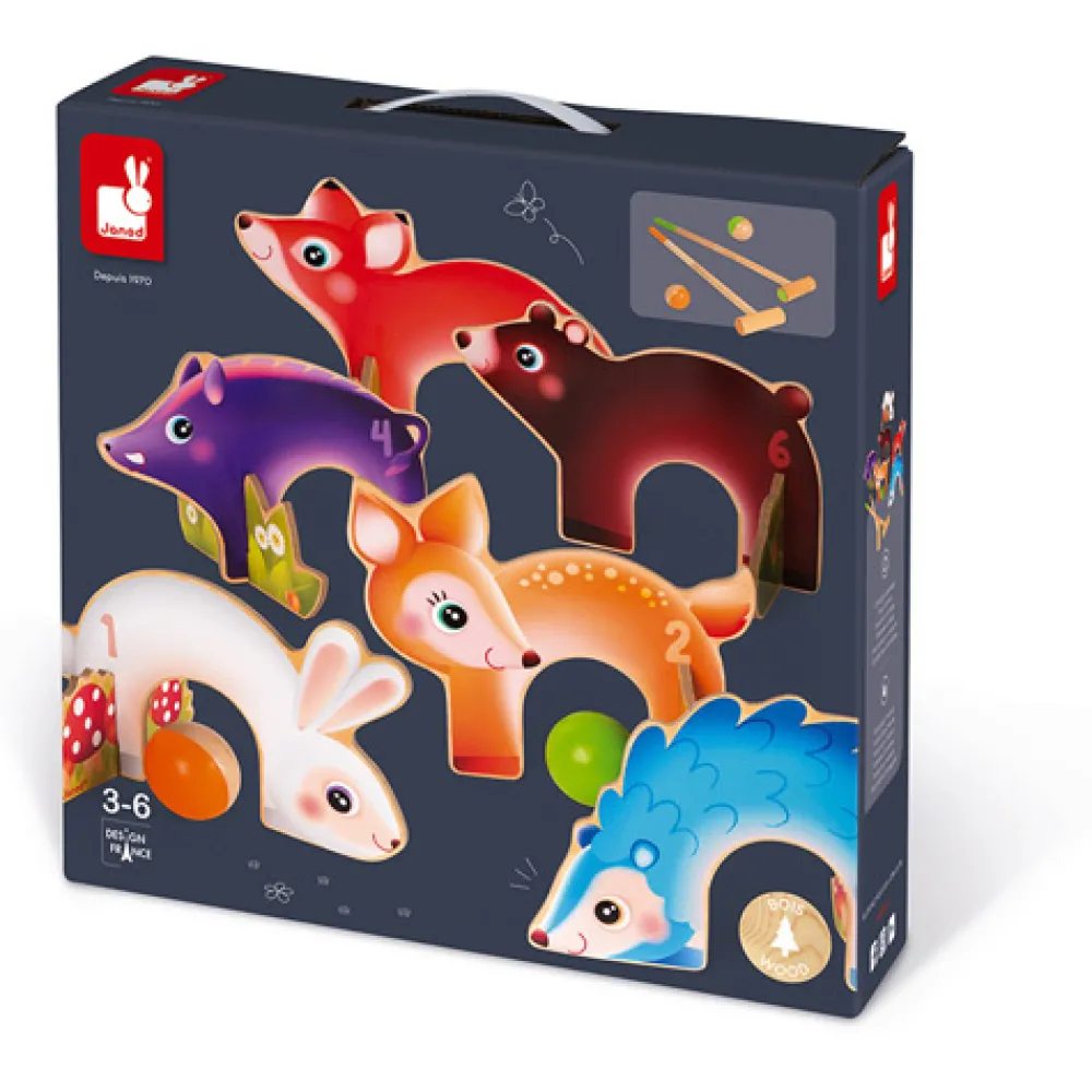Sla als eerste de bal door de 6 poortjes, die de vorm van een leuk bosdier hebben. Croquet is een eenvoudig behendigheidsspel om samen met de familie of vrienden te spelen. De allerkleinsten ontwikkelen hun behendigheid terwijl grotere kinderen veel plezier aan het spel beleven!