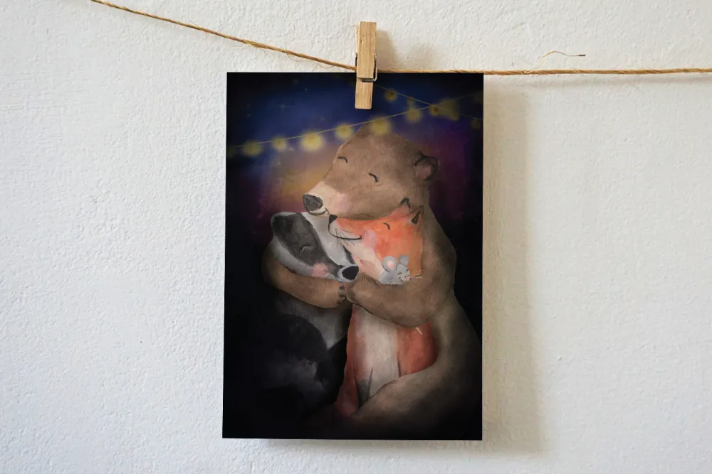 Betoverende kaart met bosdieren die lekker aan het knuffelen zijn. Een mooie orginele illustratie die verstuurd kan worden bij een feestelijke gelegenheid of bij een cadeau stoppen of als versiering aan de muur.