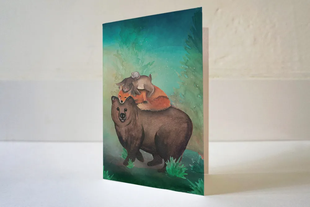 Een lieve stapel dieren in een betoverende omgeving. Een mooie wenskaart om je liefde te tonen, te laten weten dat je aan iemand denkt, de geboorte van een kleine spruit of gewoon zomaar.