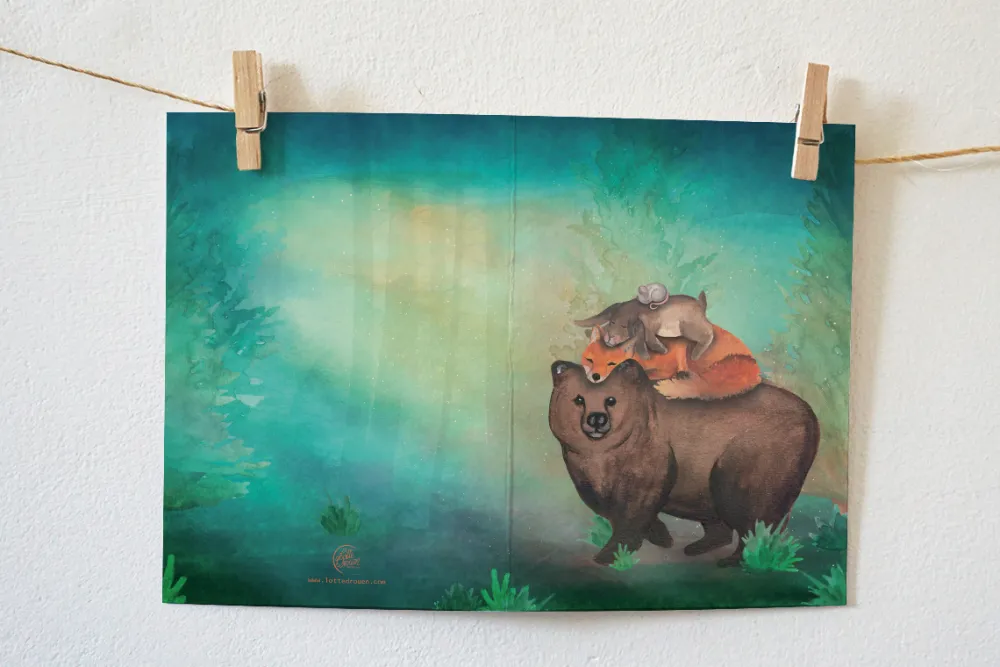 De illustratie van de kaarten van Lotte Drouen zijn door haar persoonlijk met de hand getekend en worden in kleine oplages gedrukt op mooi en dik structuurpapier. Het is zo net een klein schilderijtje. De wenskaart (gevouwen kaart) heeft een doorlopende illustratie op de achterkant. Binnenin is er ruimte voor een tekst. De wenskaart komt met een mooie kraftenvelop waarin de kaart verstuurd kan worden.