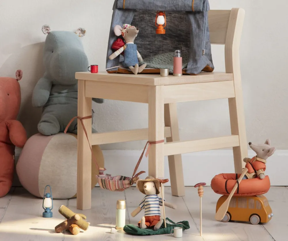 Als de Maileg-vrienden een wandeling of excursie gaan maken, is het noodzakelijk om thee mee te nemen. Deze kleine set is gemaakt met de fijnste details die het product zeer authentiek maken. Je kunt het deksel eraf schroeven en het spelen kan beginnen.