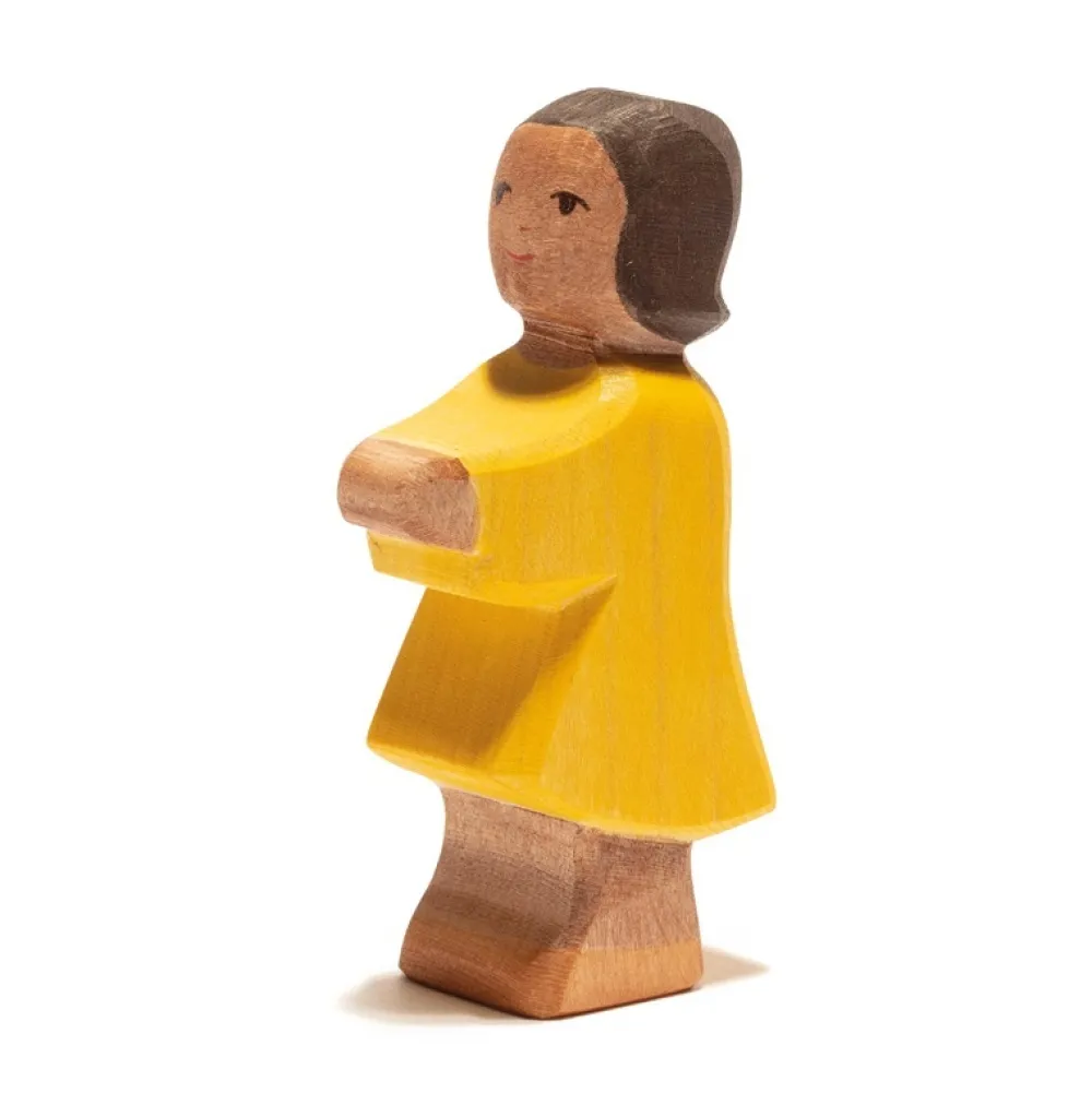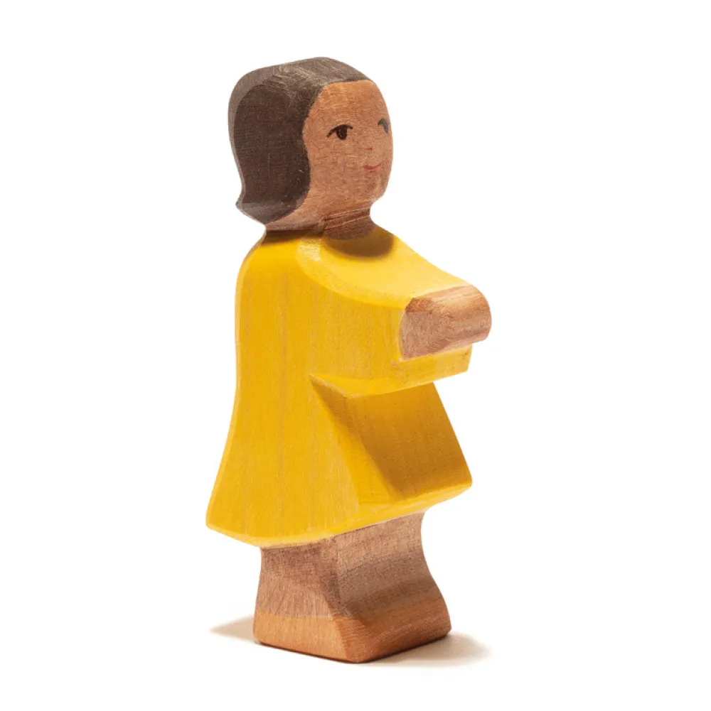 Maak je eigen familie of boerderij compleet met alle houten dieren en figuren van Ostheimer, daarhoort deze uit hout gesneden dochter natuurlijk in thuis. Deze dochter is donker gekleurd. Hoogte: 9 cm.