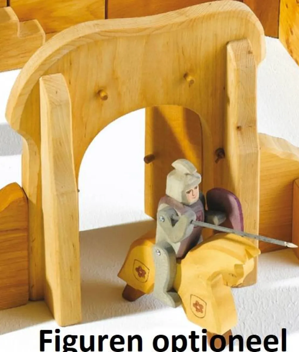 Uit de reeks ridders en kastelen van Ostheimer komt deze kasteeldeur. De deur is 2-delig en je kunt hem openen en sluiten door middel van de houten staaf die aan de achterkant wordt bevestigd. Niemand komt zo je kasteel binnen!