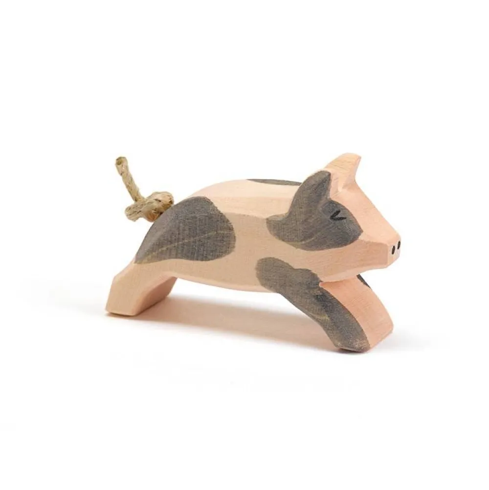 Deze met de hand en uit hout gesneden big komt uit de serie boerderijdieren van Ostheimer. Deze bigis aan het rennenen is gevlekt. Hoogte: 4cm