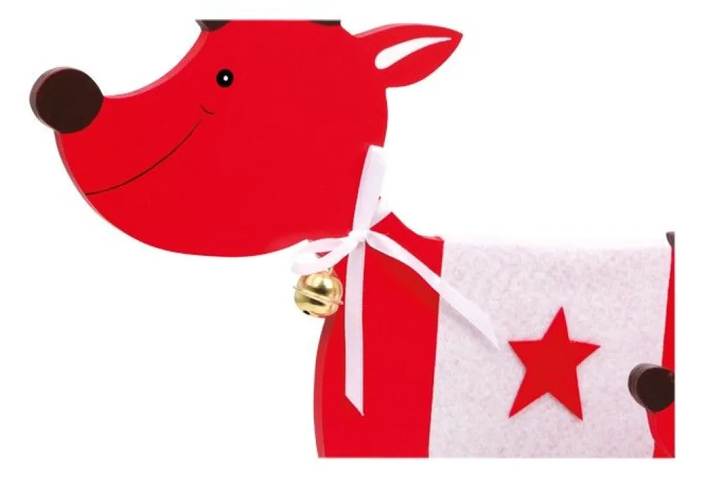 Set van 4 prachtig staande houten decoratie rendieren. Als blikvanger in arrangement of afzonderlijk opgesteld. Kleine belletjes en dekens van vilt met houten sterren sieren deze rood gelakte houten elanden.