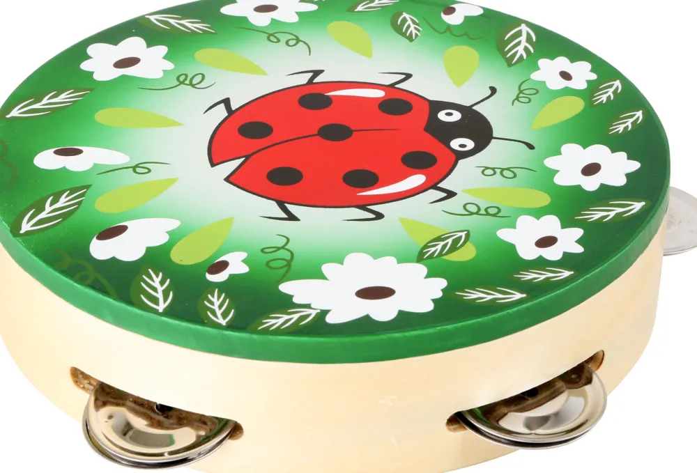 De bespanning van deze tamboerijn is vrolijk gekleurd in de vorm van een lieveheersbeestje zittend in het gras. Het ritmegevoel van kinderen wordt hiermee gestimuleerd.