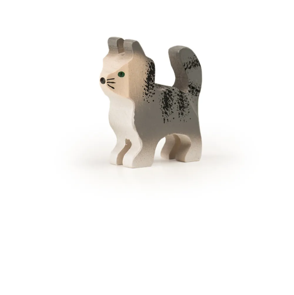 Deze grijze kater van Trauffer staat rechtop en is met de hand gemaakt van lindehout in Zwitserland, de gebruikte verf is vrij van chemicaliën. De kat is robuust genoeg om mee te spelen. Hoogte: 4 cm.