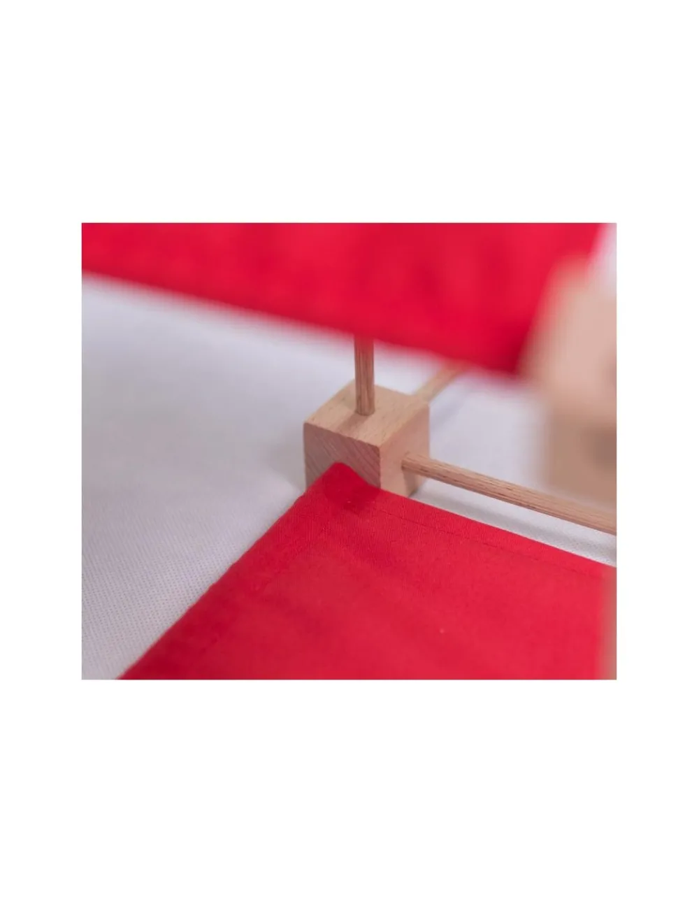 De houten vierkante en vijfhoek blokken zijn van vurenhout gemaakt en van een dusdanige vorm dat ze ook geschikt zijn voor de kleine kinderhandjes. De stokken zijn gemaakt van beukenhout wat ervoor zorgt dat ze flexibel maar ook sterk zijn. De stoffen doeken zijn gemaakt van katoen met polyester en wasbaar op 30 graden.