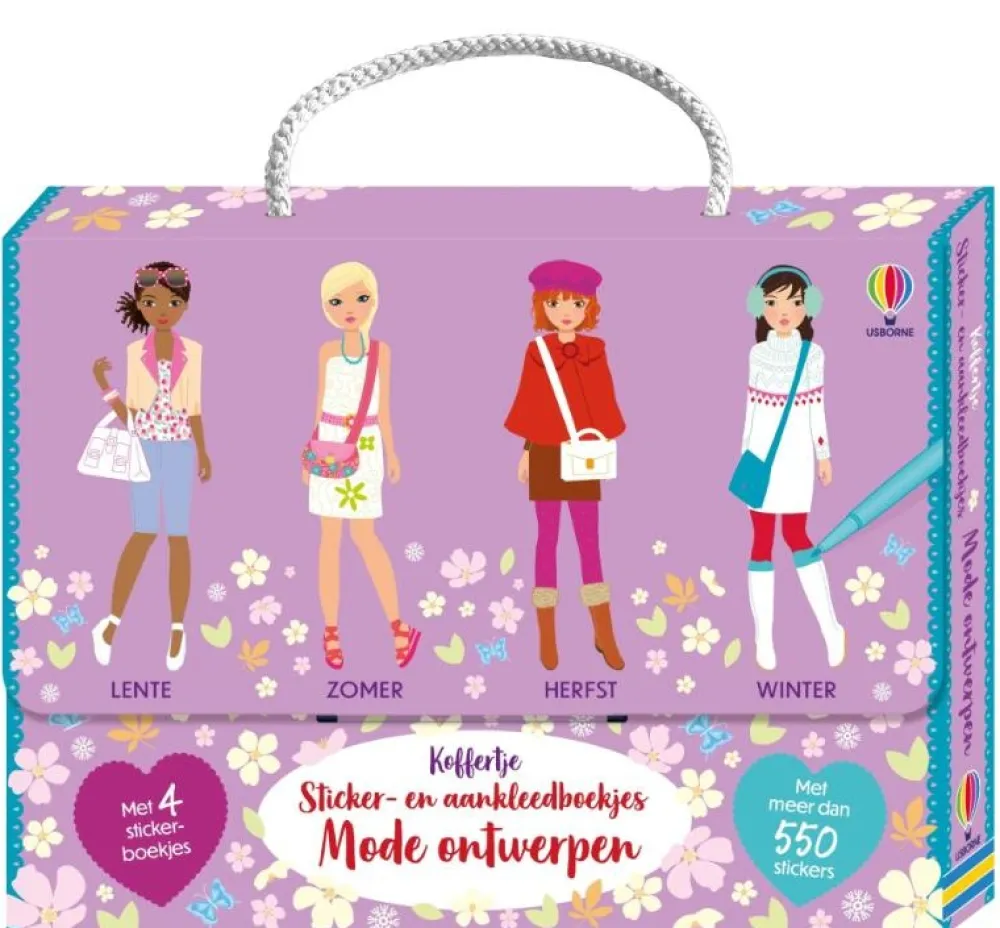 Geschenkdoos in de vorm van een koffertje dat vier boekjes bevat: lente-, zomer-, herfst- en wintercollecties. Met meer dan 550 stickers, waarvan 200 zelf in te kleuren zijn, kunnen modeontwerpers in de dop zelf outfits samenstellen.