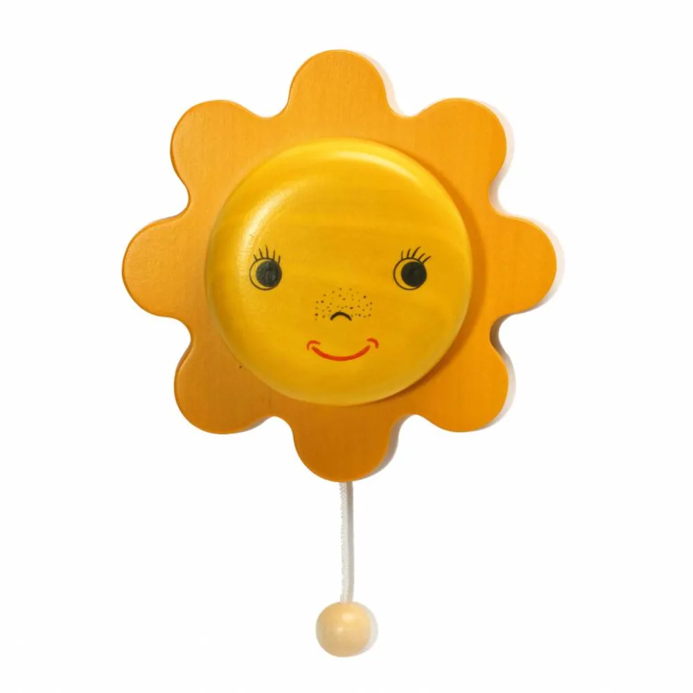 Een muziekdoosje van Weizenkorn om aan de wand te bevestigen in de vorm van een stralende zon. Als je aan de houten knop die aan het touwtje zit, trekt gaat er een mooie melodie spelen. Je kleintje zal hierbij heerlijk in slaap vallen.