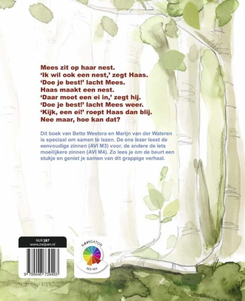 Dit gezellige samenleesboek op AVI M3 en M4 is speciaal voor beginnende lezers. Je leest het verhaal over Haas en zijn nest met een ei samen. De één leest de eenvoudige tekst op AVI M3 voor, de ander leest de iets moeilijkere tekst op AVI M4 voor.