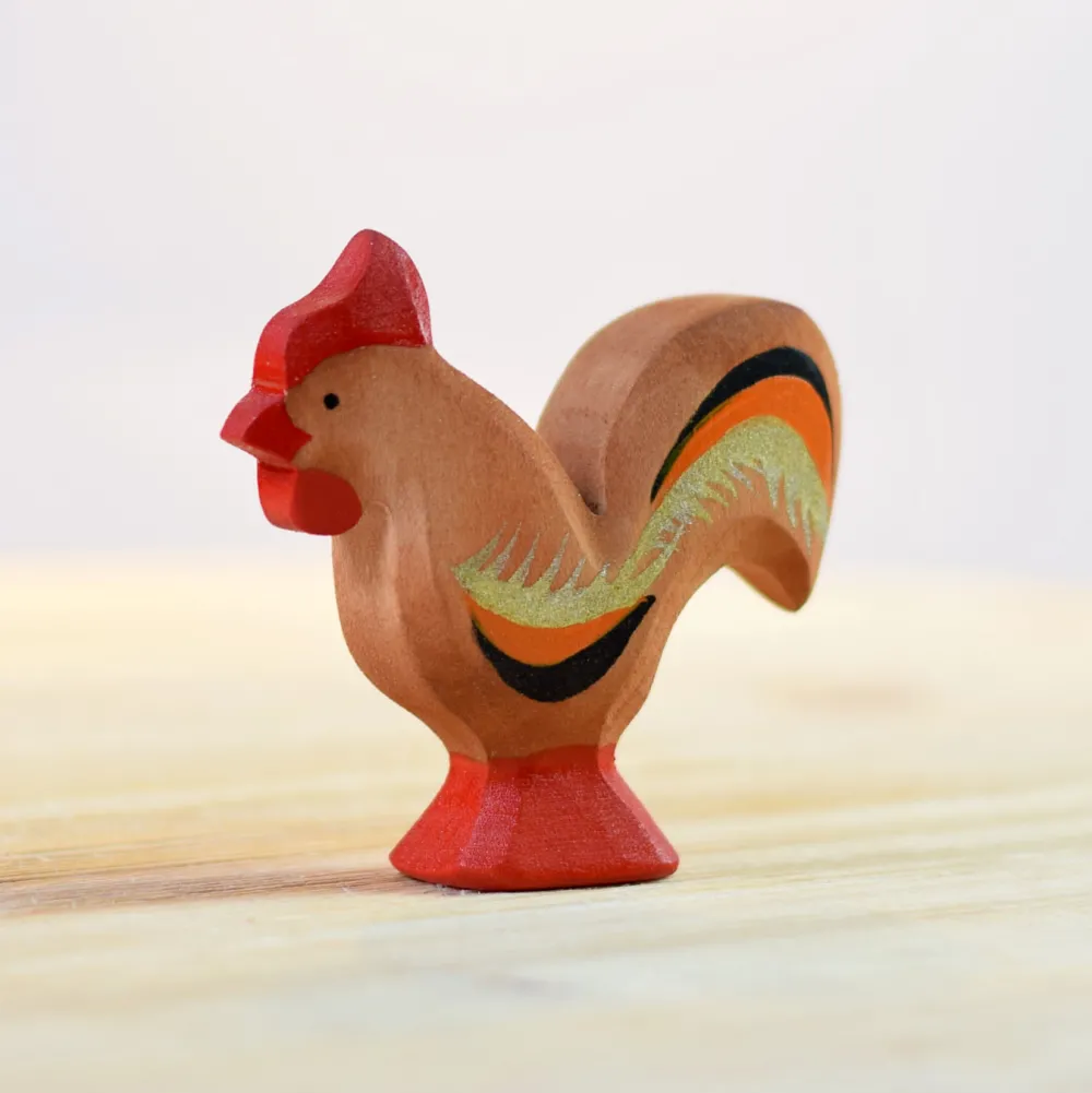 Dit is de haan van bumbu toys gemaakt van esdoornhout. De haan valt goed op met zijn rode kam en zwart oranje verenkleed. De houten haan is 6 cm hoog.
