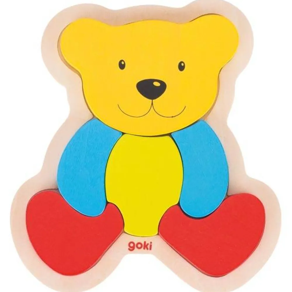 Leg de 6 stukjes van deze inlegpuzzel beer van Goki in de juiste volgorde en dan zie je een bont gekleurde beer te voorschijn komen.