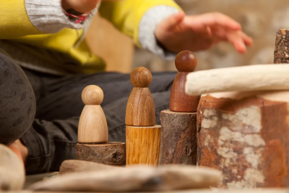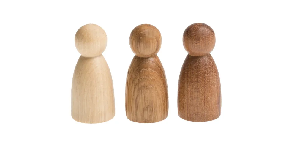 3 houten Nins of poppetjes van Grapat in drie verschillende houtsoorten: beuken, eiken en sapeli.
