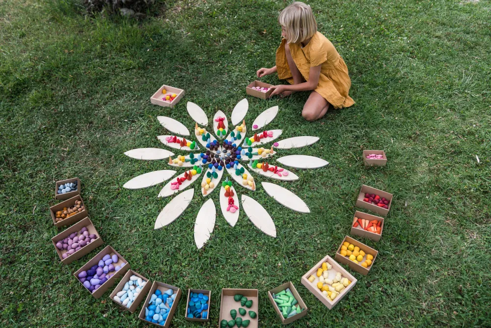 Deze set van Grapat bevat 24 platte stukken berkenhout in de vorm van bloembladen (29 cm). Perfect ongestructureerd materiaal dat zich leent voor verschillende speelactiviteiten met een open einde.