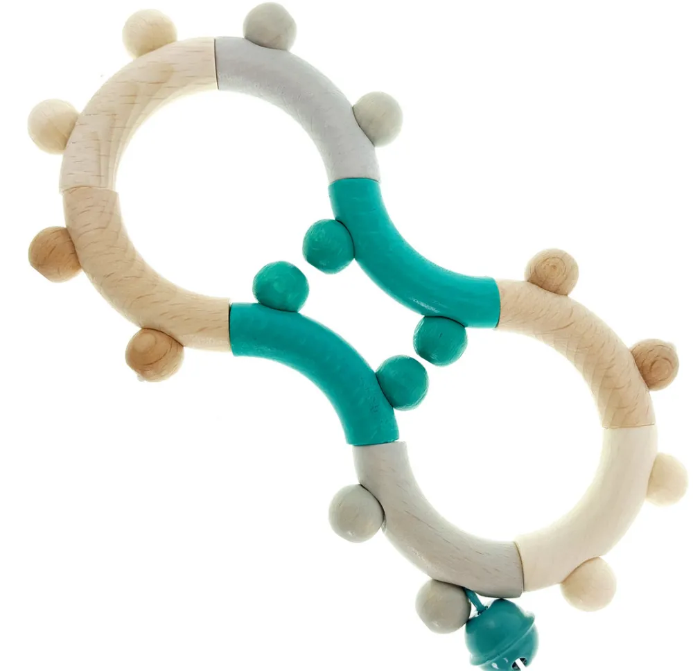 Dit grijpfiguur van Hess is hoogwaardig afgewerkt. Deze rammelaar is achtvormig en voorzien van een aantal houten balletjes en een lief belletje. Turkoois en grijs gekleurd. Door de vorm gemakkelijk vast te pakken, ook voor de kleine kinderhandjes.
