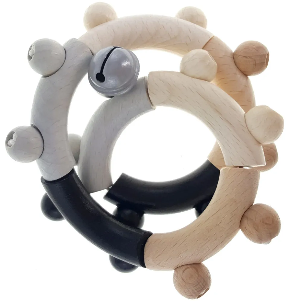 Dit grijpfiguur van Hess is hoogwaardig afgewerkt. Deze rammelaar is achtvormig en voorzien van een aantal houten balletjes en een lief belletje. Zwart en grijs gekleurd. Door de vorm gemakkelijk vast te pakken, ook voor de kleine kinderhandjes.