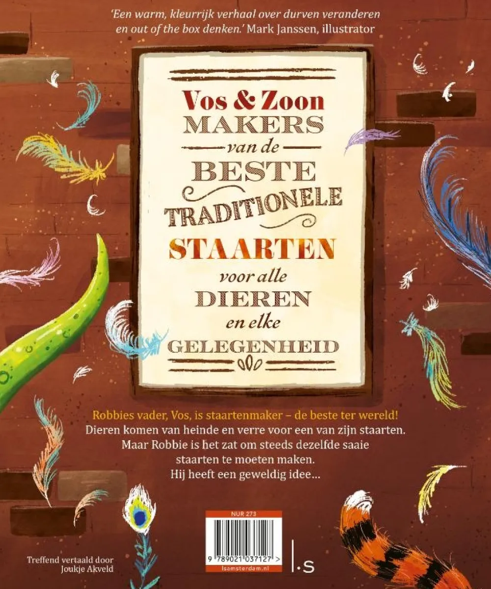 Robbie helpt zijn vader Vos in zijn winkel. Vos is de beste staartenmaker ter wereld. Allerlei dieren komen naar zijn winkel om de mooiste staarten te laten maken. Er zijn staarten voor bruiloften, voor verjaardagen en zelfs voor de eerste schooldag. Robbie meet de klanten op voor de perfecte staart. En dat is niet altijd makkelijk! Maar Robbie heeft er schoon genoeg van om dag in, dag uit dezelfde soort staarten te maken. Hij heeft een geweldig idee… ‘Wat een geweldig prentenboek van Paddy Donnelly! Het is een warm en kleurrijk verhaal over durven veranderen en out of the box denken.’ Mark Janssen, illustrator