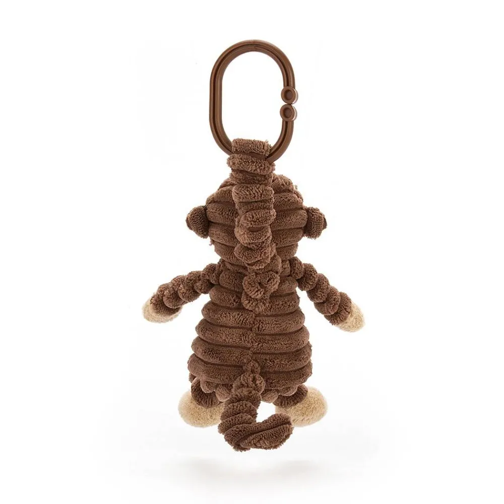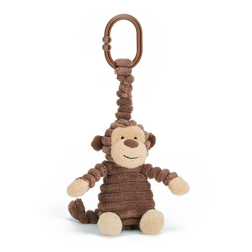 Cordy roy baby monkey bibberknuffel van Jellycat zorgt voor veel plezier. Als je aan deze aap trekt dan gaat hij trillen, wat heerlijk aanvoelt bij de kleine handjes. Hij kan bevestigd worden aan de buggy, Maxi-Cosi of bedje. Hoogte: 14 cm.