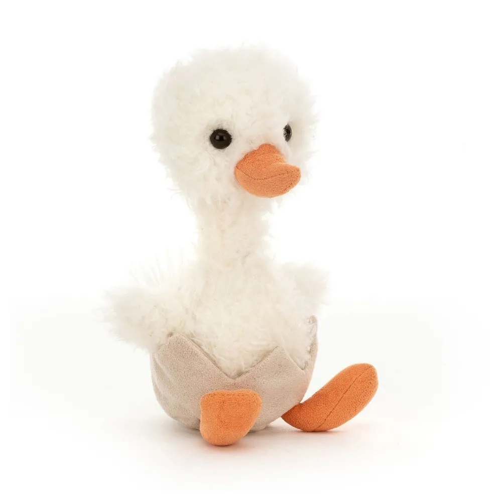Quack Quack Duckling van Jellycat is net uit het ei gekomen en kan niet wachten om de wijde wereld te verkennen. Deze schattige eend heeft een zachte creme kleurige vacht en oranje pootjes en snavel. Hoogte zittend: 16 cm.