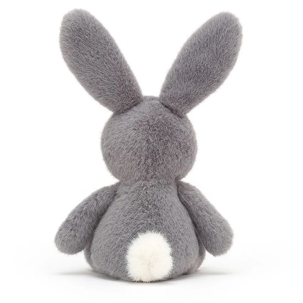 Fuzzle Bunny van Jellycat heeft grote zwarte ogen, lange oren en een zachte grijze vacht. Dit konijn is gek op knuffelen.