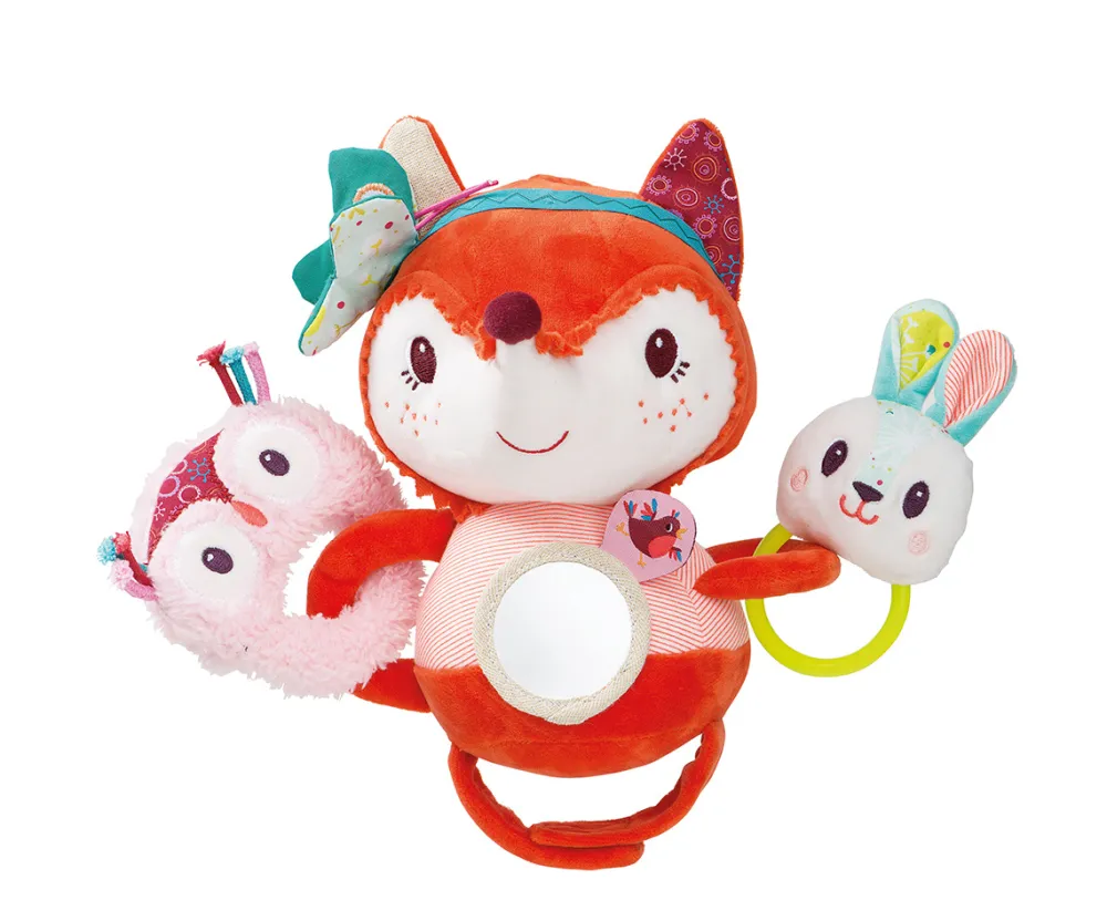 Alice gaat graag mee met jou wandelen. Maak haar vast aan de riemen van de buggy of het kinderzitje en hou haar dicht bij jou. Ze zal je zintuigen prikkelen met al haar zachte en leuke activiteiten: een konijn met spiegeltje, een knuffeluiltje, een knispe