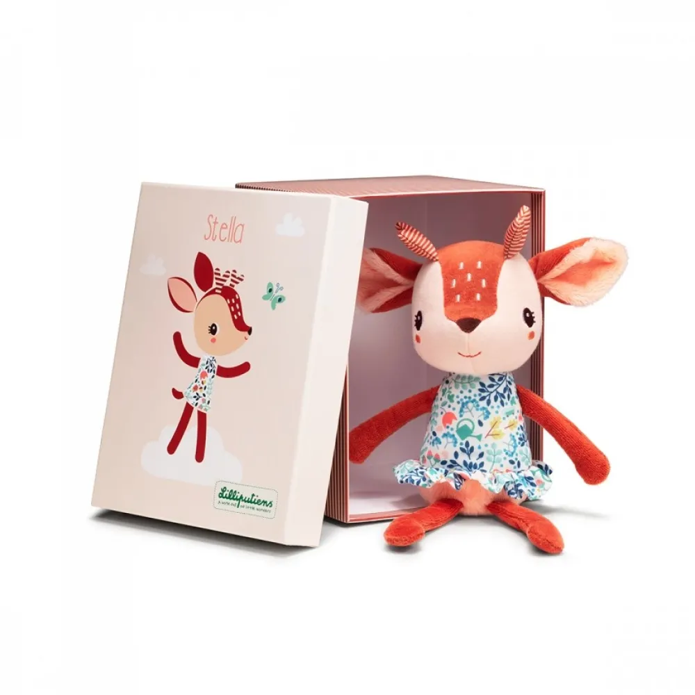 Stella het vrolijke hertje doet niets liever dan knuffelen. Ze is gemaakt van organisch katoen en zit in een prachtig geïllustreerde geschenkdoos.