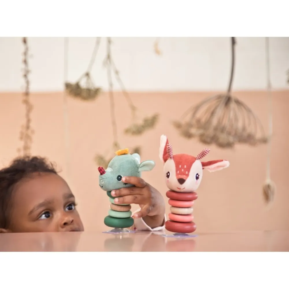 Deze rammelaar swingt vrolijk heen en weer bij het minste duwtje. Dankzij het zuignapje blijft hij stevig recht staan en kan je hem overal vasthechten.