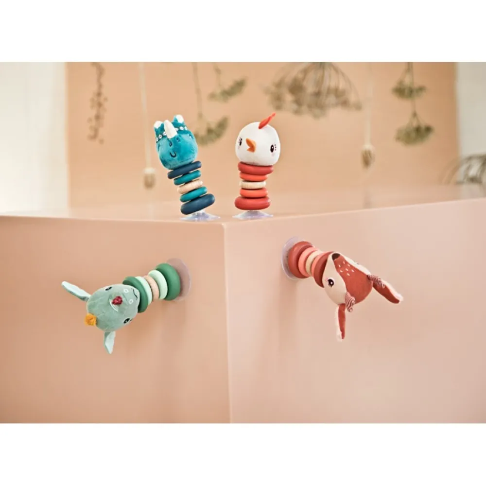 Deze rammelaar swingt vrolijk heen en weer bij het minste duwtje. Dankzij het zuignapje blijft hij stevig recht staan en kan je hem overal vasthechten.