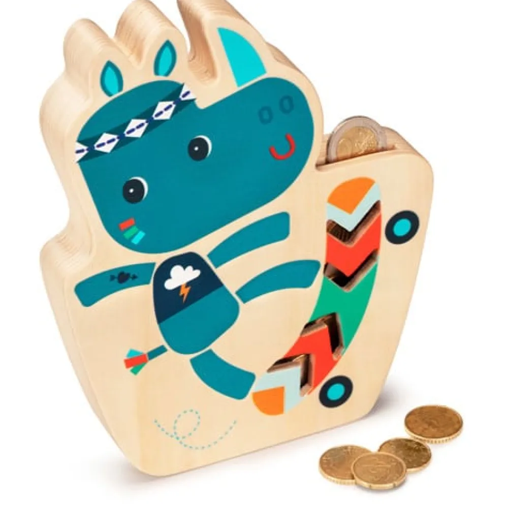 Marius de neushoorn van Lilliputiens waakt over jouw spaarcentjes in deze mooie houten spaarpot. Door de gaatjes aan de voorkant kun je zien hoeveel je al gespaard hebt. Aan de achterkant is een opening gemaakt om bij het geld te kunnen.
