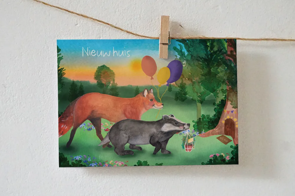 Kaart Nieuw huis! Een lieve originele illustratie met een vos en das die op bezoek gaan bij muis die net verhuisd is. De kaart kan verstuurd worden als iemand gaat verhuizen of net een nieuw huis heeft! Wie stuur jij deze vrolijke kaart?