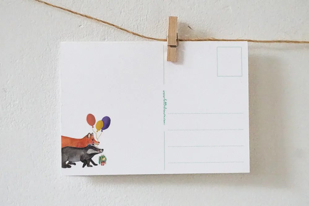 De illustratie van de kaarten van Lotte Drouen zijn door haar persoonlijk met de hand getekend en worden in kleine oplages gedrukt op mooi en dik structuurpapier. Het is zo net een klein schilderijtje. Ook de achterkant van de kaart heeft een mooi ontwerp met kleurrijke lijntjes voor de naam, adres, woonplaats en postzegel en natuurlijk ook nog een leuke illustratie.