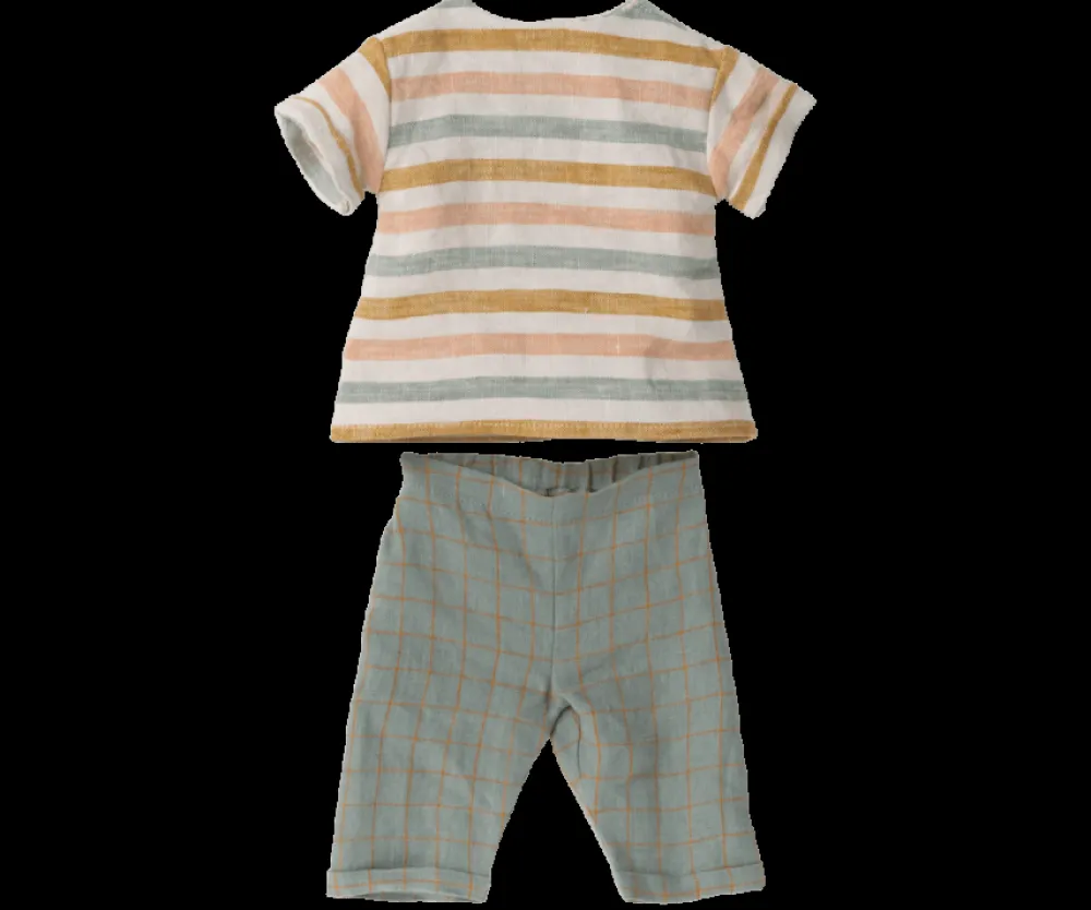 De bunny & rabbit collectie van Maileg is gemaakt van zacht natuurlijk linnen en katoen – wat een heerlijk handgevoel en uitstraling geeft. Dit konijn draagt een mooie broek en shirt.