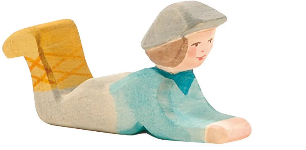 Deze herdersjongen van Ostheimer ligt en heeft zijn hoofd naar voren gericht. Ostheimer figuren worden met de hand gemaakt van inheems geteeld hout. De gebruikte verf en lak is op milieuvriendelijke basis dus ook geschikt voor kinderen. Lengte: 6 cm